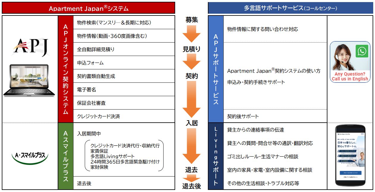 Apartment Japan®契約システムでは、募集~契約~入居~退去までの全期間において、貸主様(ご利用加盟店様)と外国人ユーザーの方々(ご入居者様)との言語の壁を解消するためのサポートサービスをご利用いただけます。