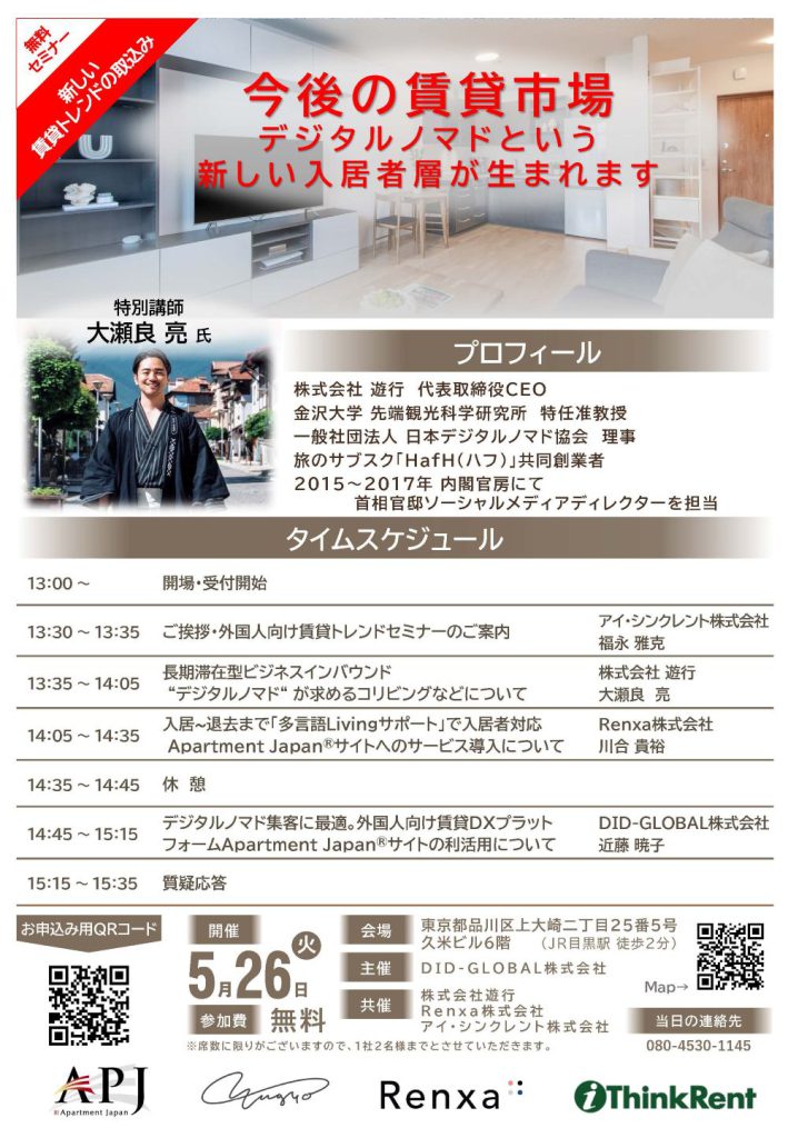 外国人向け賃貸市場における新たな入居者層として注目される「デジタルノマド」。日本におけるデジタルノマドの第一人者のひとりである株式会社遊行 大瀬良亮氏を特別講師として招聘し、その動向と、実務における対応方法をテーマとしたセミナーを開催いたします。