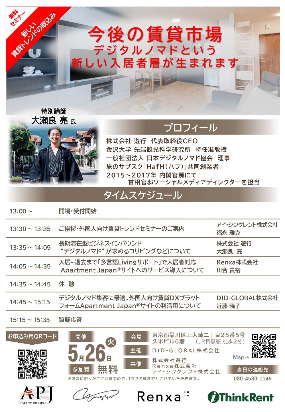 本セミナーでは、日本初のデジタルノマド専門マーケティングファーム ㈱遊行 大瀬良亮氏より、その市場の実態と賃貸ビジネスの可能性を解説いただきます。
